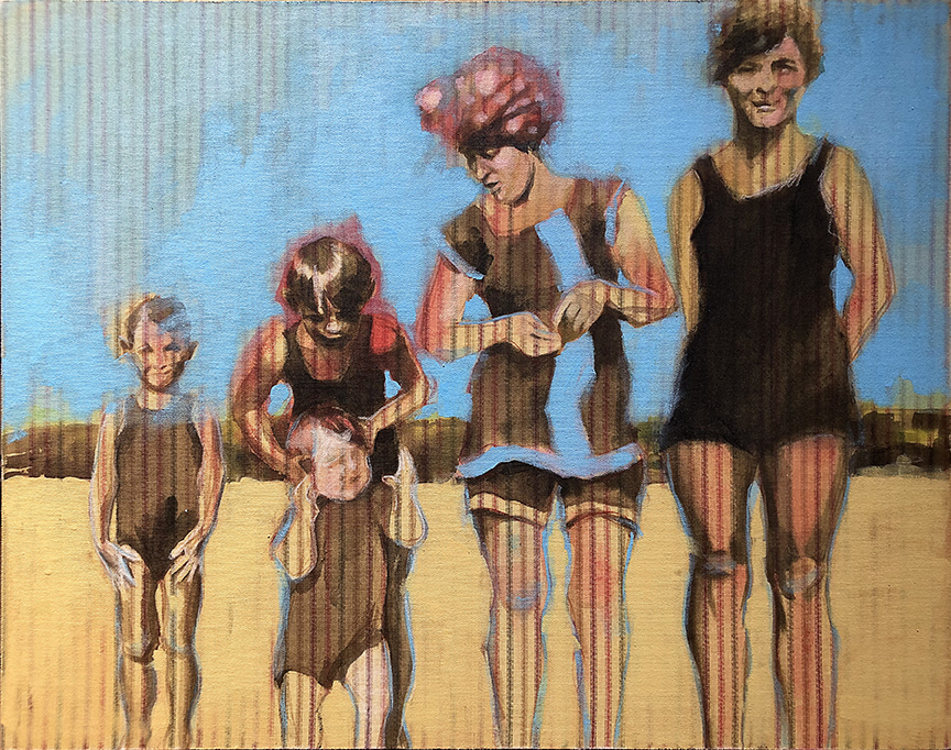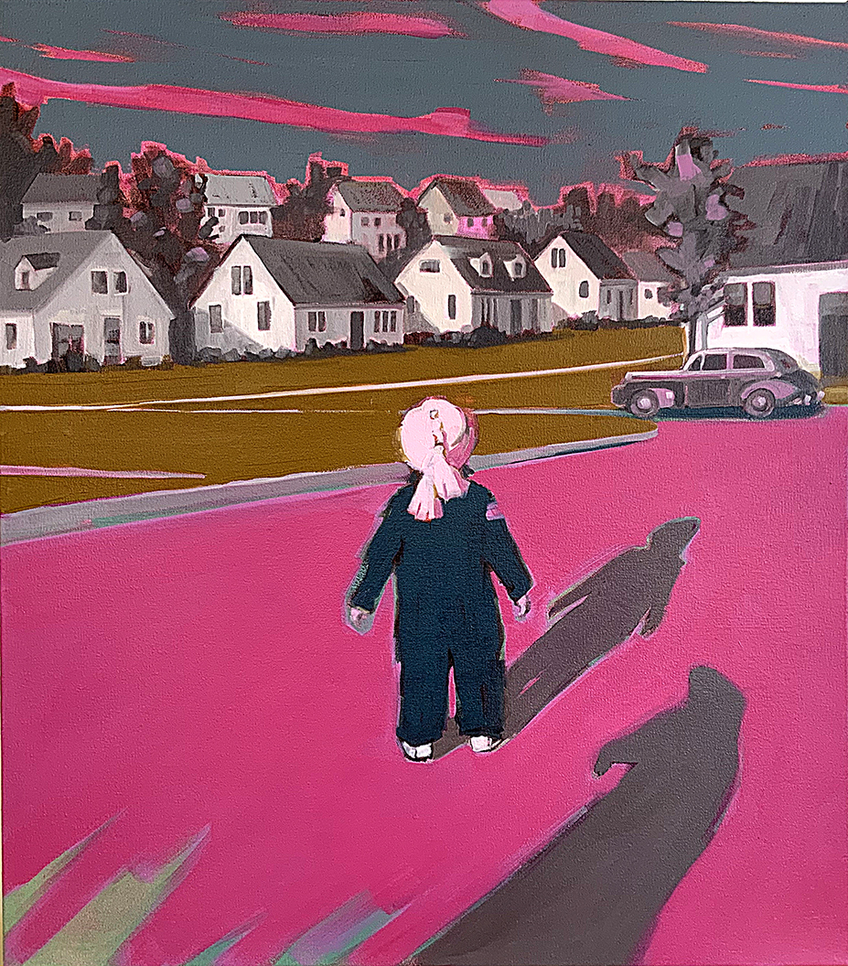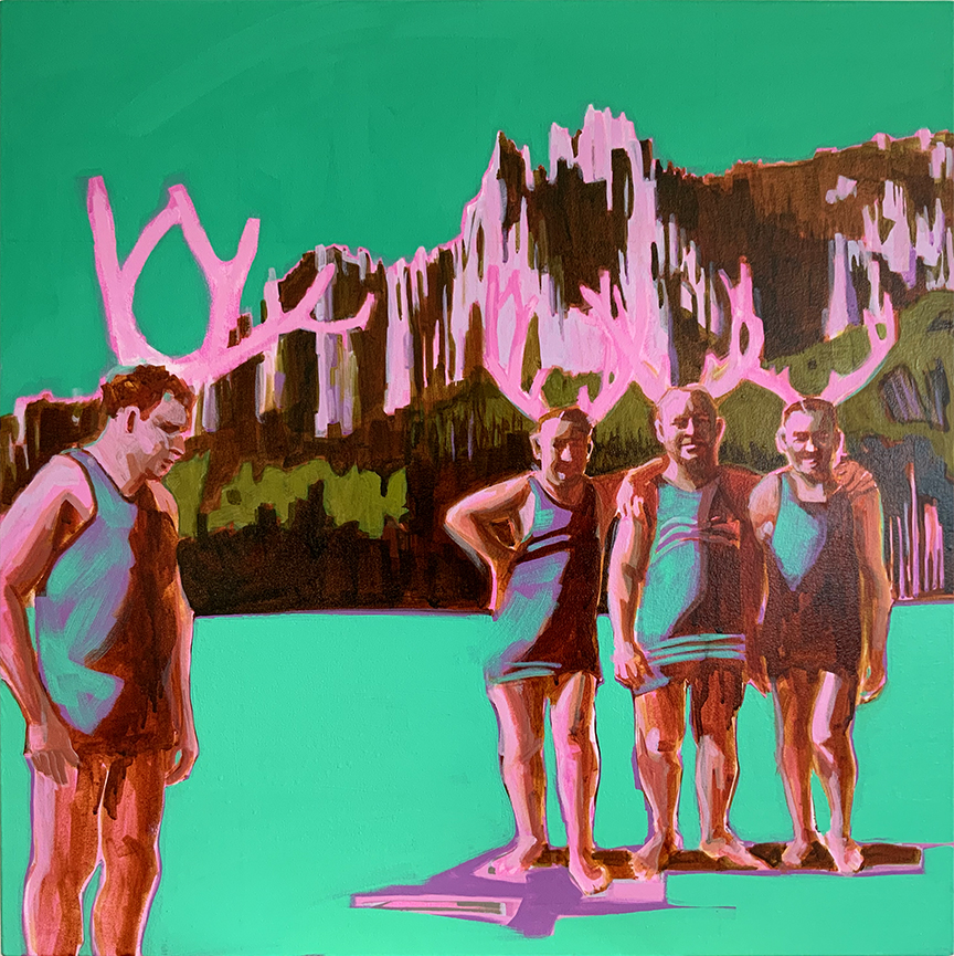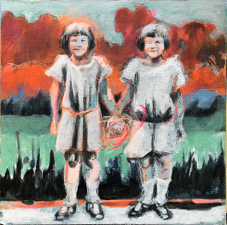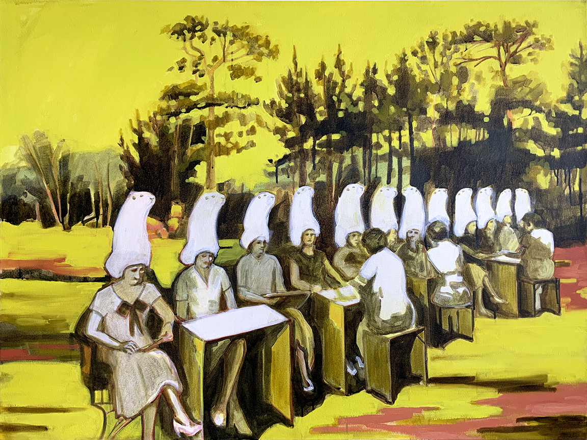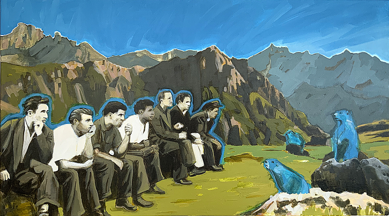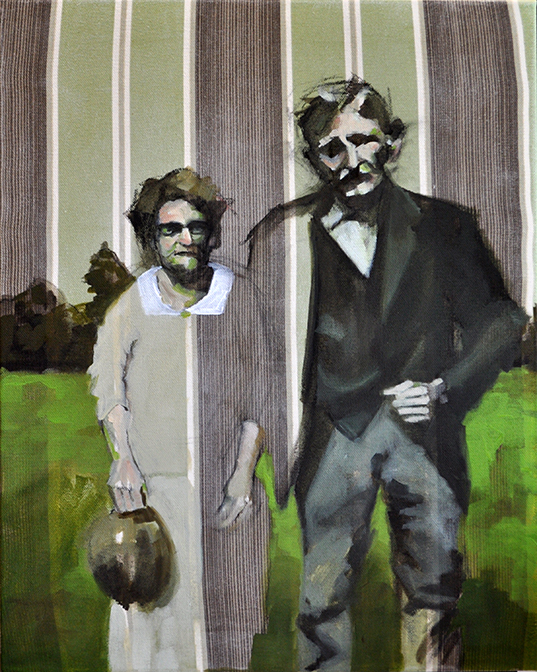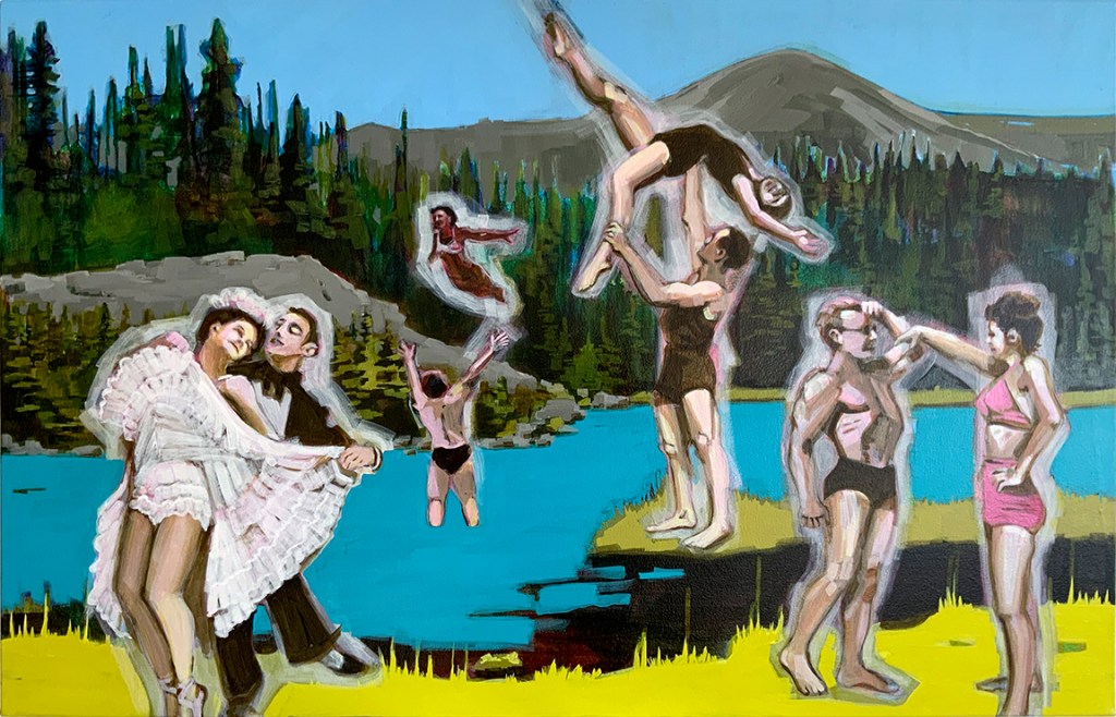 I reference old photographs to allude to the temporal persistence of long-lasting familial mindsets and use the landscape as a setting to represent the wild terrain of our subconscious mind. These paintings are twisted versions of grown-up dramas that are humorous on the surface but sometimes dark and insidious underneath, with far-reaching consequences.