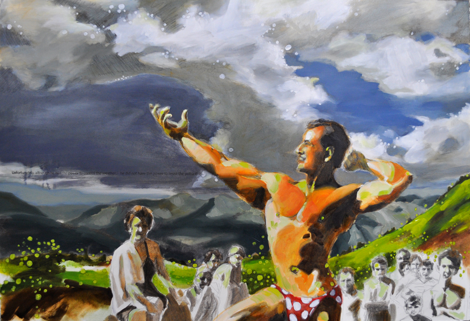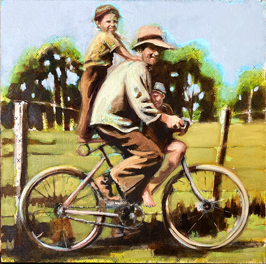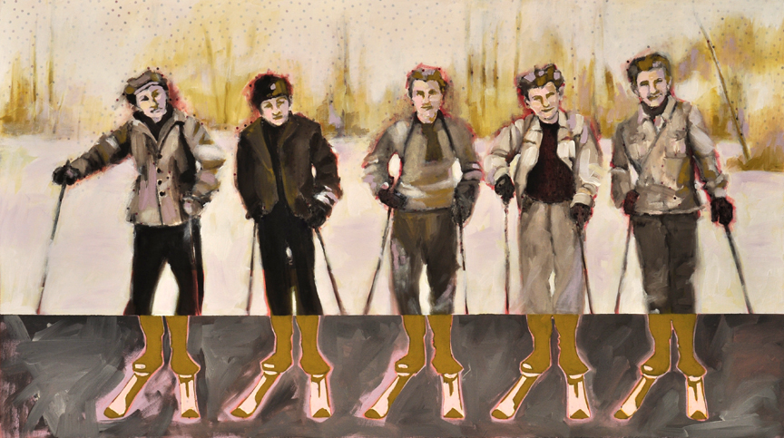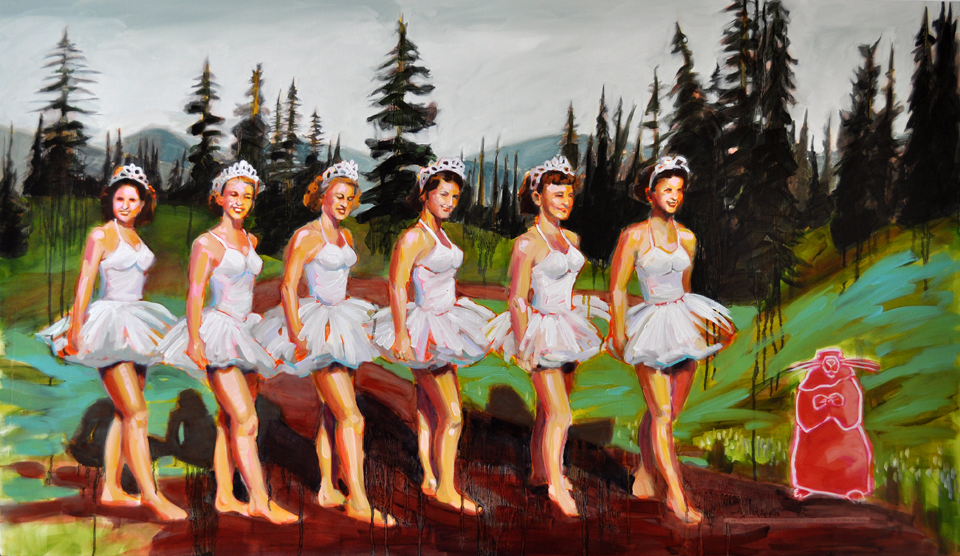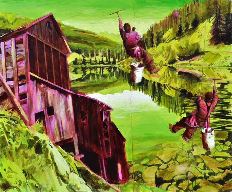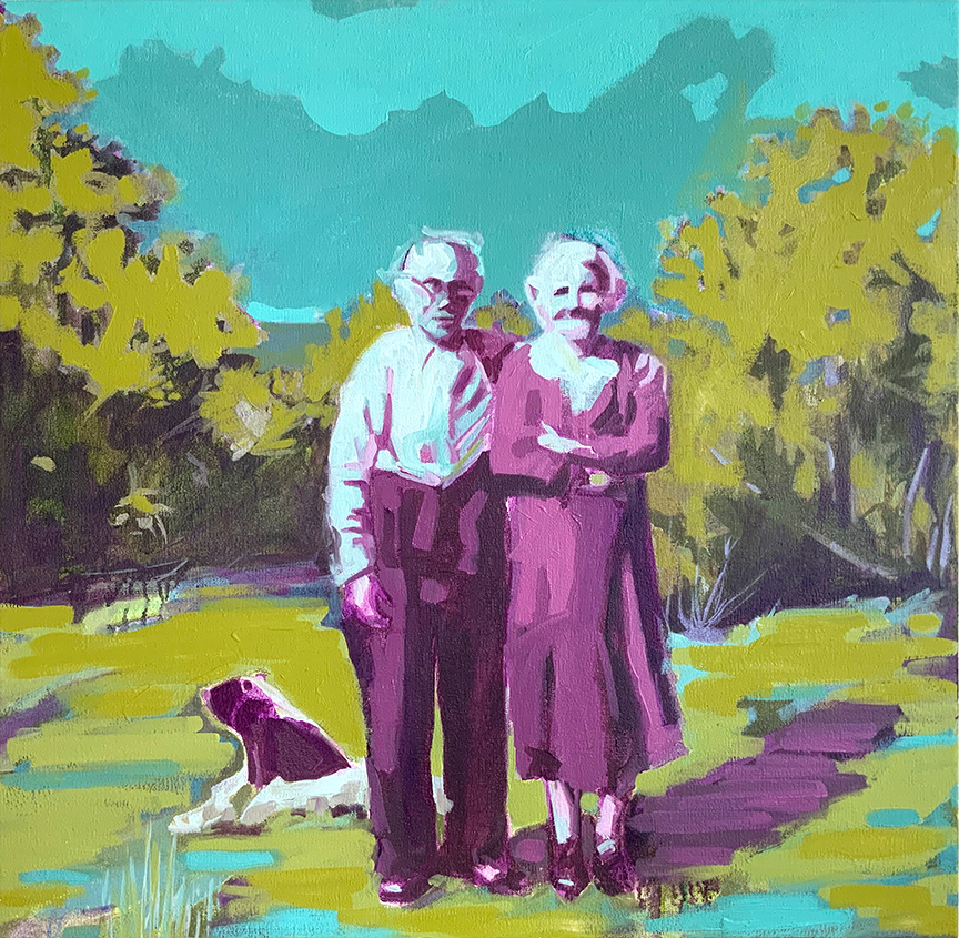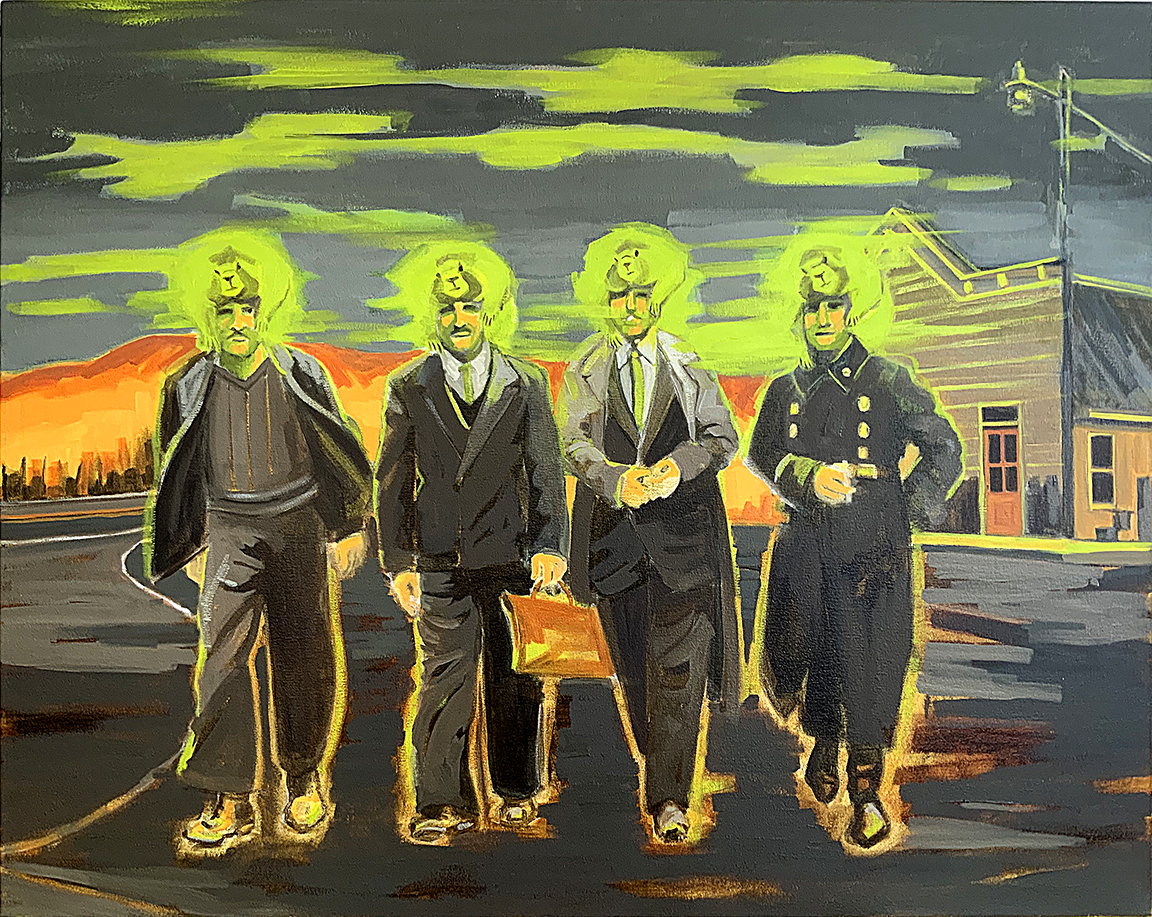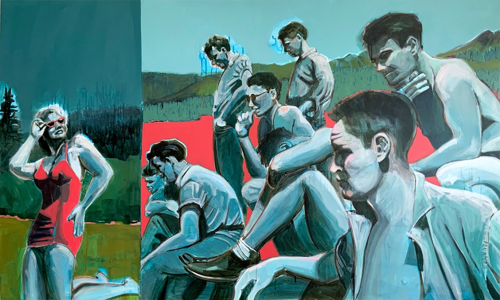 I reference old photographs to allude to the temporal persistence of long-lasting familial mindsets and use the landscape as a setting to represent the wild terrain of our subconscious mind. These paintings are twisted versions of grown-up dramas that are humorous on the surface but sometimes dark and insidious underneath, with far-reaching consequences.