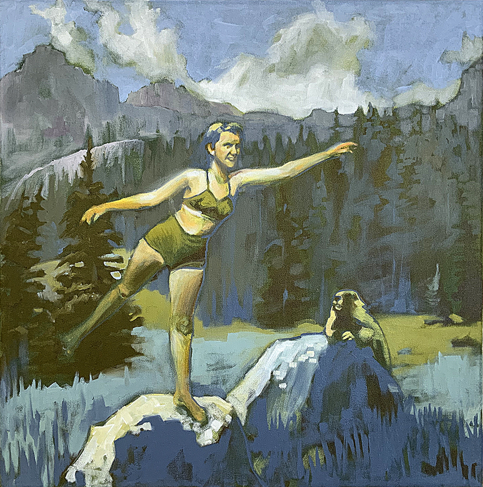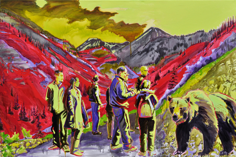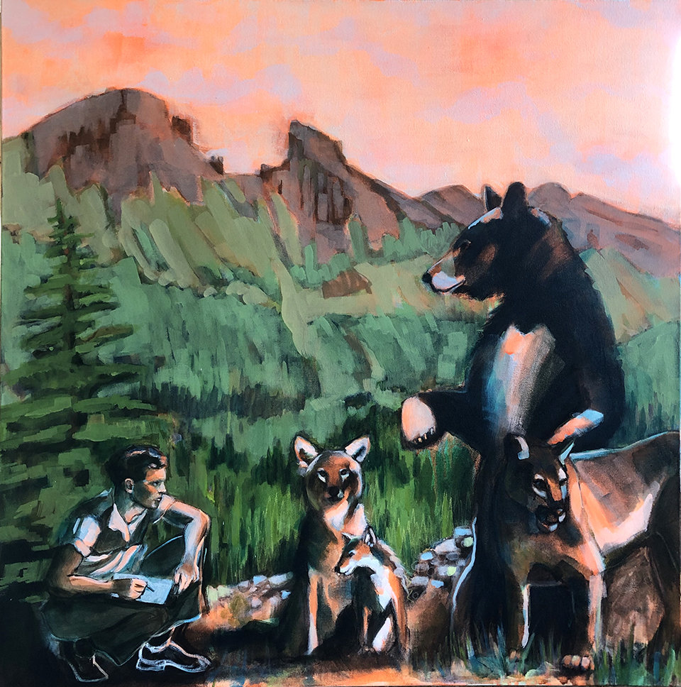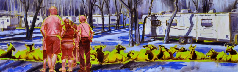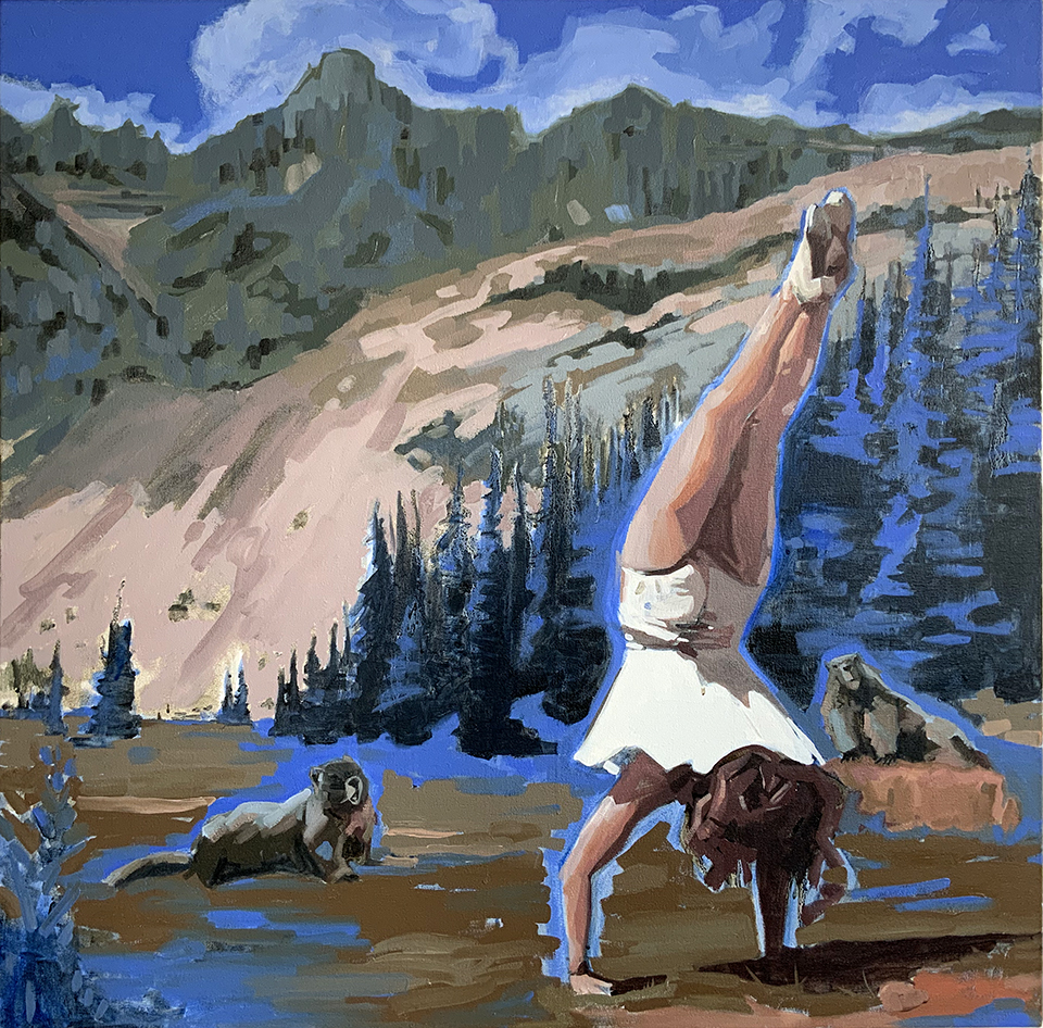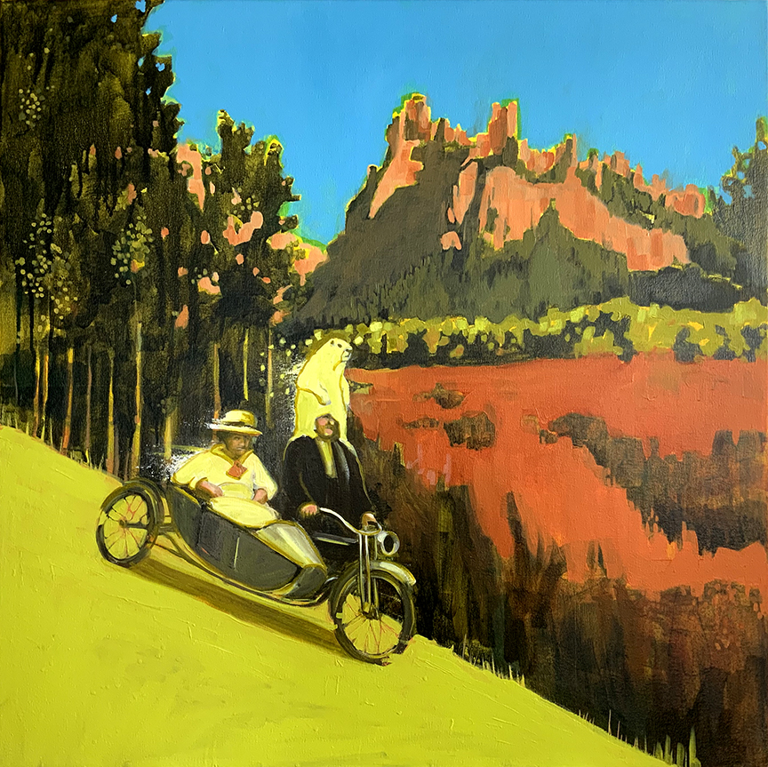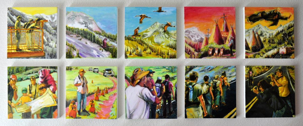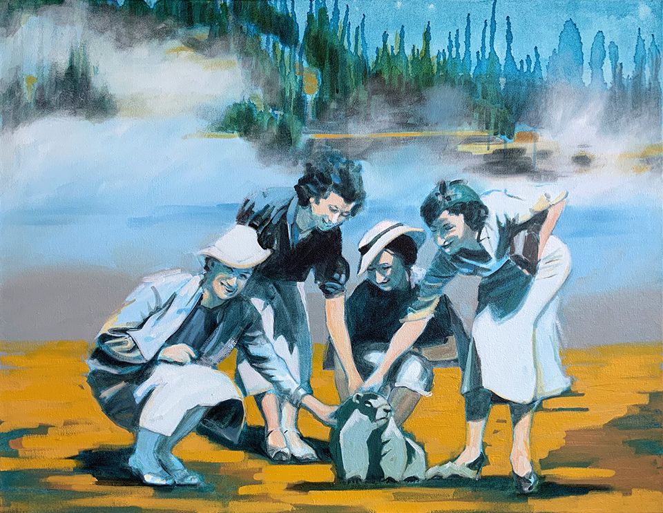 Artist’s statement: The series “We Want Our View and Eat It Too” explores how we, as tourists, interact with the natural world, especially when visiting National Parks and other beautiful places. These paintings examine our relationship with the natural landscape, its wild creatures, and preserved historical sites, while questioning our notions of fair use and conservation.