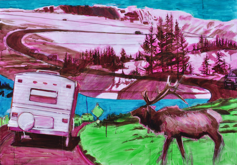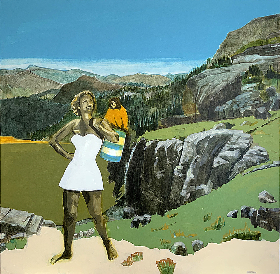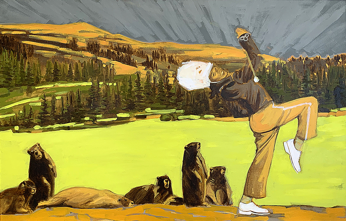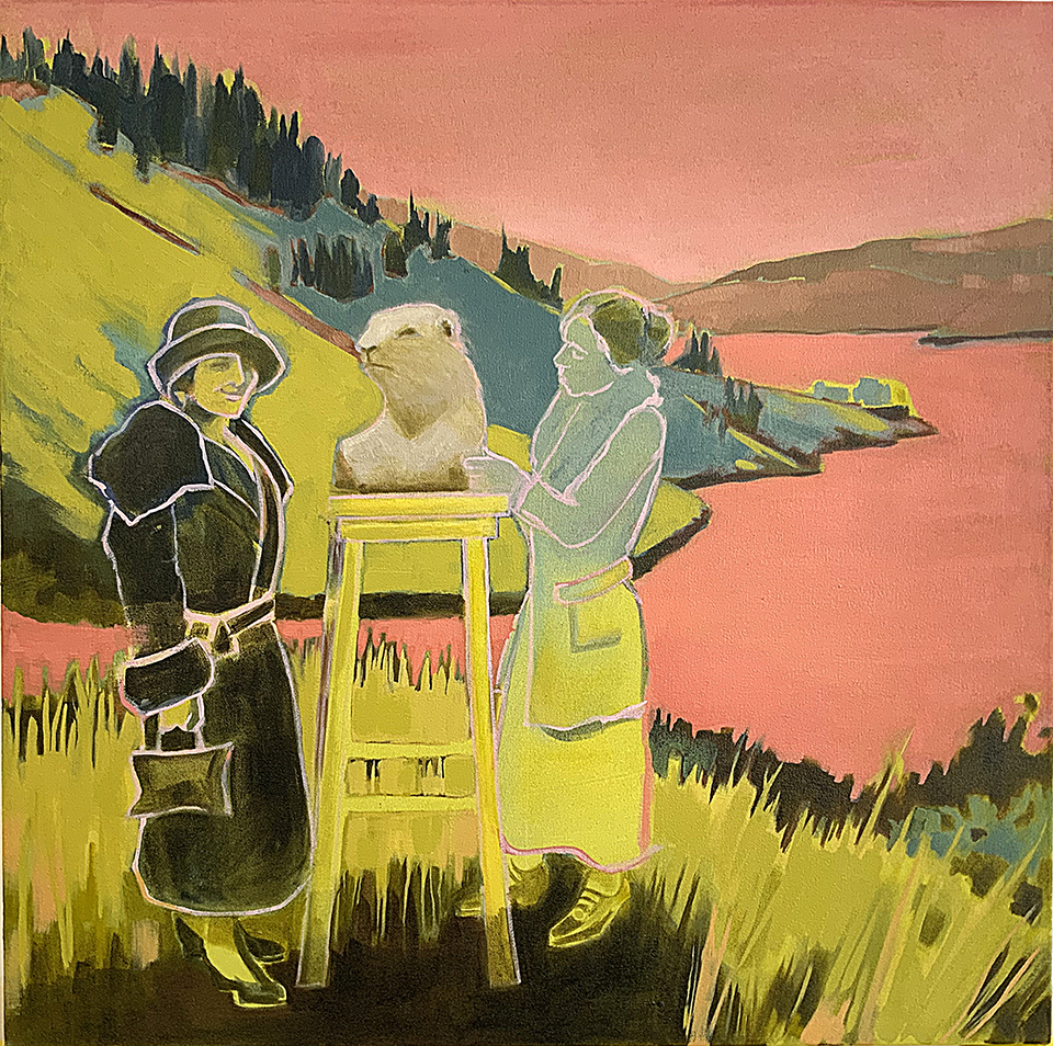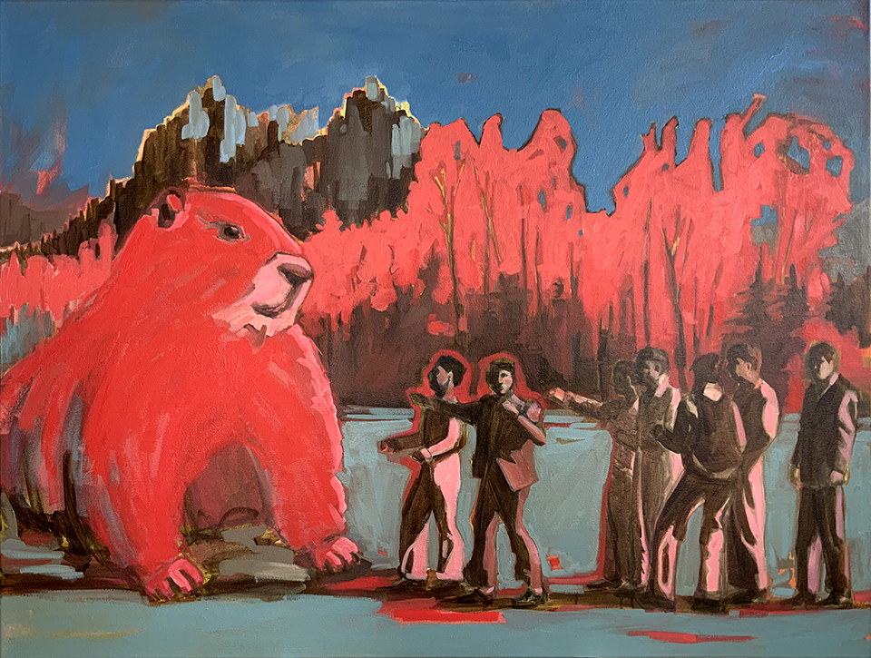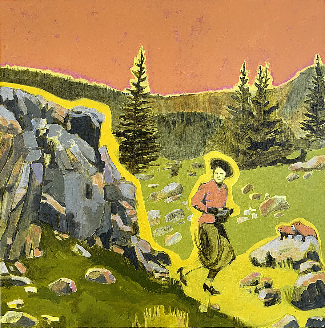 Artist’s statement: The series “We Want Our View and Eat It Too” explores how we, as tourists, interact with the natural world, especially when visiting National Parks and other beautiful places. These paintings examine our relationship with the natural landscape, its wild creatures, and preserved historical sites, while questioning our notions of fair use and conservation.