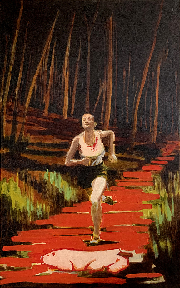 Artist’s Statement: The Human/Nature series began as a mashup of animal and human behaviors, an exploration of mate-seeking and the power of pheromones, visual cues, adornment, competition, attraction, and ritual. It was meant to be a romp into the clunky, awkward strangeness that occurs when humans and their animal kin hunt for a mate. However, as I delved deeper into the paintings and their meanings, I realized that what began as a playful exploration had become a complex, confusing, and emotional journey that I hadn’t expected. While this series is humorous on the surface, the topic of human sexuality is a complex and sometimes emotionally loaded subject. Yes, humans are mammals, and we behave in ways that mimic our wild kin; however, human sexuality is far more complex and evolves as our lives change and we age. In addition, the “Me Too” movement revealed how many of us have been victimized by sexual violence. I am struck by the fact that humans are supposed to possess a higher level of consciousness than our animal kin, but we sometimes fail to behave that way.